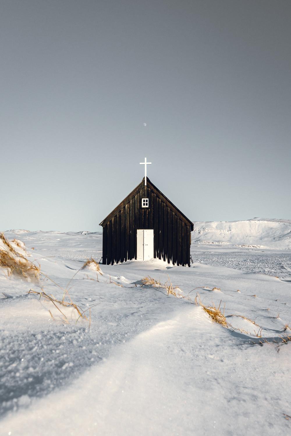 A small black church stands alone in a vast, snow-covered landscape, framed by soft light and endless sky. Above it, the faint presence of the moon lingers—quiet, distant, and still. There is a sense of calm here that feels almost sacred, where silence is not empty, but full. Available on fine print paper, framed or canvas.